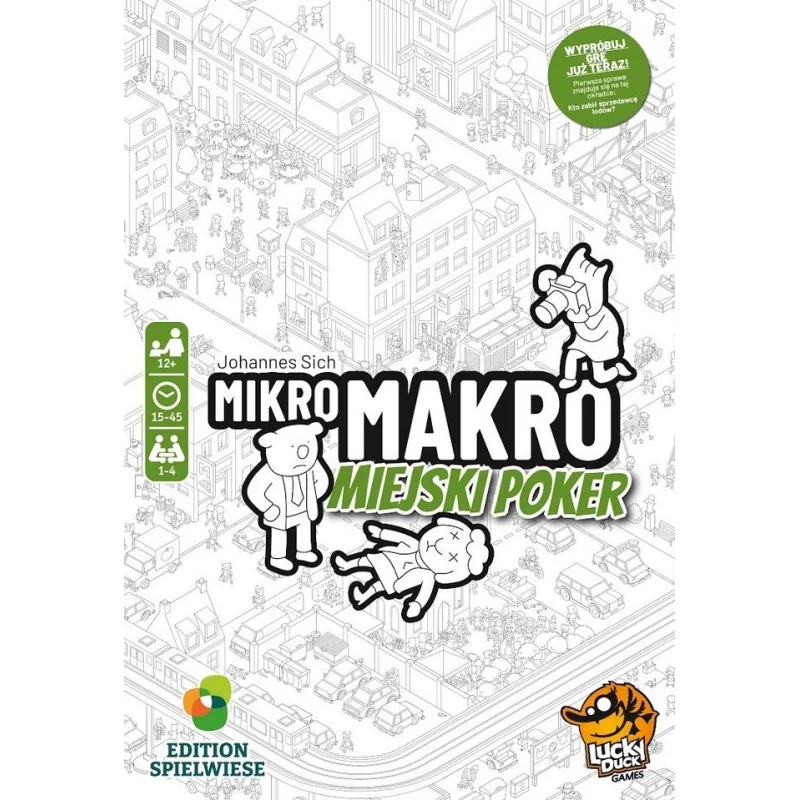 MikroMakro: Miejski Poker to czwarta odsłona bestsellerowej serii kooperacyjnych gier detektywistycznych MikroMakro, w której gracze analizują ogromną mapę pełną szczegółów, by rozwiązać nietuzinkowe zagadki kryminalne. W tej części śledztwa przenoszą się do nowej dzielnicy miasta – z jeszcze bardziej zakręconymi historiami i przestępstwami do rozwikłania. Gra przeznaczona jest dla młodzieży i dorosłych – idealna na wieczory w duecie lub w małej grupie.