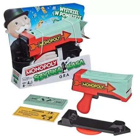 Monopoly Szybka Kasa to doskonała i zabawna gra dla całej rodziny. Pora zarobić trochę łatwej kasy! Nowość od Monopoly, która umożliwi wam szastanie mamoną! Załaduj banknoty Monopoly do Wyrzutni Banknotów, a następnie wystrzel je w powietrze wraz z kartami Szansy! Gracze rzucają się na pieniądze, próbując złapać ich jak najwięcej! Nie