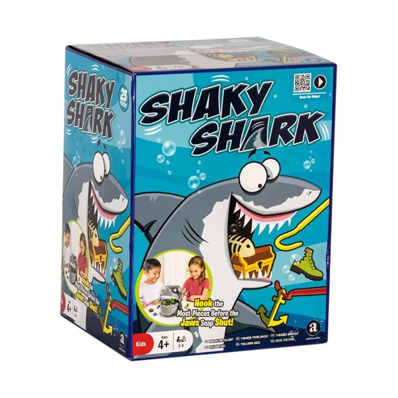 Sprawdź swoje umiejętności połowowe i refleks przeciwko Shaky Shark! Ten głodny rekin trzęsie się i chwieje, próbując wyłowić kawałki z jego ust - uważaj albo on ugryzie twoją rękę! Musisz poruszać się szybko: licznik odlicza minuty, aż rekin zrzuci twoją wędkę! Kto zdoła wydobyć jak najwięcej kawałków z ust rekina?