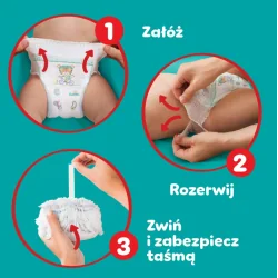 - Zawiń zużytą pieluszkę i zabezpiecz taśmą samoprzylepną znajdującą się z tyłu każdej sztuki Pampers Pants.