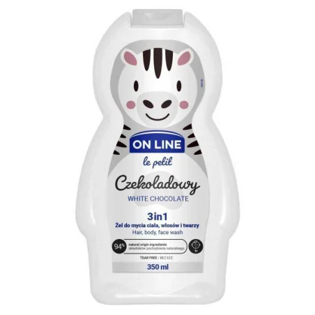 Delikatny czekoladowy żel 3w1 ON LINE o zapachu białej czekolady to idealny kosmetyk do codziennej pielęgnacji najmłodszych. Łagodnie myje i pielęgnuje ciało, włosy oraz twarz dziecka, pozostawiając skórę miękką i pachnącą. Formuła żelu jest nawilżająca,
