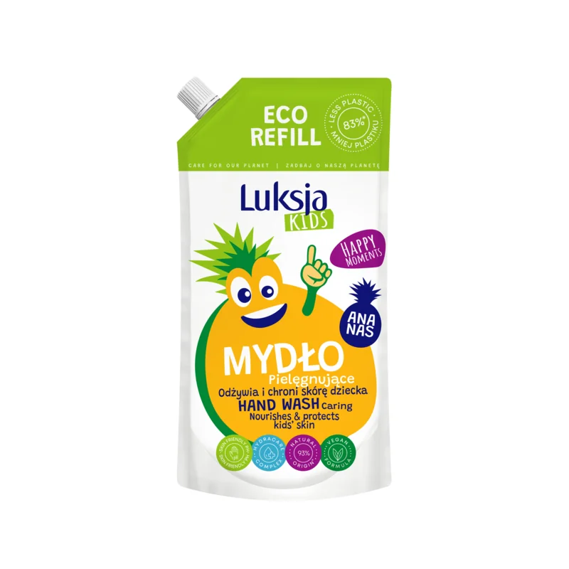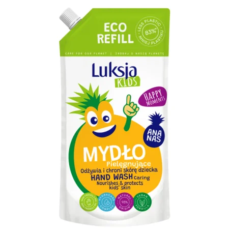Luksja Kids Pielęgnujące Mydło w Płynie Ananas to produkt, który łączy skuteczne oczyszczanie z łagodną pielęgnacją. Formuła mydła została stworzona z myślą o delikatnej skórze dziecka, aby codzienna higiena była przyjemnością i bezpieczna dla naskórka.