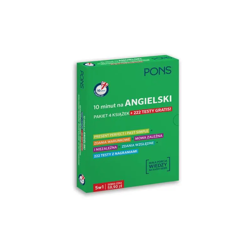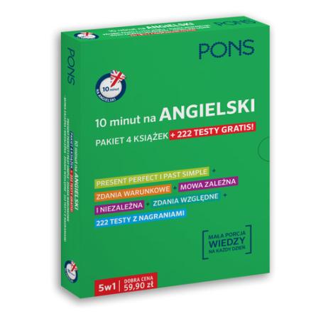 Pakiet pięciu książek z serii 10 minut na angielski to 4 publikacje z najważniejszymi i najbardziej przydatnymi zagadnieniami gramatyki angielskiej. W pudełku znajdziesz oprócz nich 222 testy, które pomogą Ci utrwalić wszystkie zagadnienia.