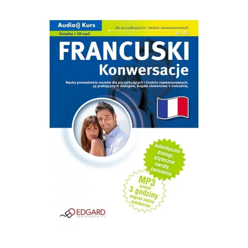 Francuski Konwersacje przeznaczone są dla osób początkujących oraz średnio zaawansowanych, które chcą zdobyć lub udoskonalić umiejętność prowadzenia swobodnych rozmów w języku francuskim. Kurs jest szczególnie polecany tym, którzy wybierają się w podróż do krajów francuskojęzycznych. Kurs to 55 dialogów, nauka przydatnych zdań, słów i zwrotów oraz zestawy ciekawych ćwiczeń. Tematy rozmów związane są z praktycznymi, życiowymi sytuacjami, takimi jak szukanie pracy, problemy z komunikacją miejską, podróże, wizyta u lekarza, zakupy, a także z życiem rodzinnym i towarzyskim. Książka (128 str.) zawiera dialogi, zdania, słówka oraz zwroty wraz z tłumaczeniami. W każdej z 15 rozbudowanych lekcji znajdują się gotowe wzorce dialogów oraz zestawy słówek na każdą okazję. W podręczniku zamieszczono również kilkadziesiąt różnorodnych ćwiczeń - doskonalących umiejętność swobodnego komunikowania się oraz utrwalających nowo poznany materiał. Na końcu podręcznika znajduje się klucz odpowiedzi. Wysokiej jakości nagrania (ponad 200 minut) pozwalają osłuchać się z językiem, poznać prawidłową wymowę oraz przećwiczyć rozumienie ze słuchu i uczyć się metodą powtarzania. Dialogi oraz zdania wraz z tłumaczeniami zostały udźwiękowione przez profesjonalnych lektorów. Ich regularne powtarzanie pomoże opanować nowy materiał.
