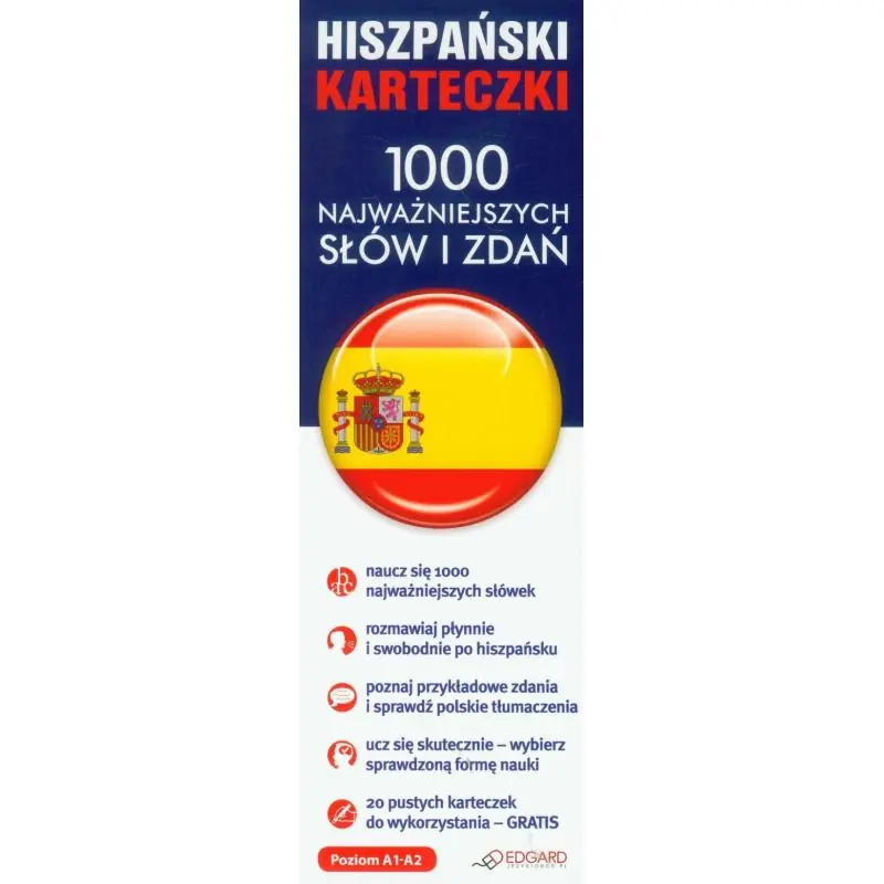 Wydanie 2011r. Oprawa pudełko. Format 8,5x25,5cm. Hiszpański Karteczki 1000 najważniejszych słów wraz z przykładowymi zdaniami to wyjątkowy zestaw ponad tysiąca ponumerowanych, usztywnionych kartoników do nauki języka hiszpańskiego. Nauka z kursem pozwala szybko i skutecznie opanować najczęściej używane w języku hiszpańskim słówka. Opanowanie tego unikalnego zestawu umożliwia swobodną komunikację na poziomie podstawowym oraz czytanie ze zrozumieniem większości tekstów w języku hiszpańskim. Przykłady użycia wszystkich słów w zdaniu to gotowe wzorce komunikacyjne.