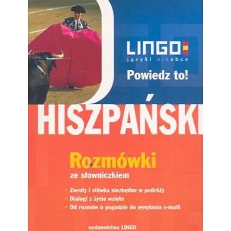 Rozmówki LINGO z serii "Powiedz to!" odznaczają się aktualną i sprawdzoną w praktyce zawartością, wygodnym formatem oraz dołączonymi do książki nagraniami na AUDIO CD z udziałem rodowitych Hiszpanów i polskiego lektora. Ponadto rozmówki wzbogacone zostały o przykładowe dialogi od rozmów o pogodzie do wysyłania e-maili; tablice z najczęściej poszukiwanymi słowami i informacjami; zarys gramatyki; słowniczek.