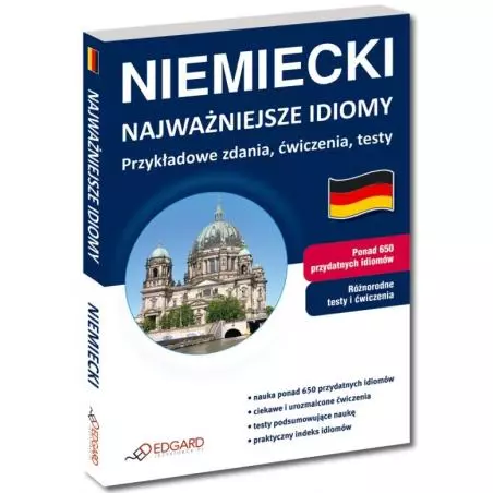 Niemiecki Najważniejsze idiomy Przykładowe zdania, ćwiczenia, testy umożliwia poznanie ponad 650 wyrażeń idiomatycznych niezbędnych do swobodnego i błyskotliwego porozumiewania się w języku niemieckim. Praca z książką bazuje na metodzie aktywnej nauki w oparciu o zestaw 90 różnorodnych ćwiczeń. Książka adresowana jest do osób posługujących się językiem niemieckim na poziomie średnio zaawansowanym (B1-B2 wg klasyfikacji Rady Europy), które chcą poszerzyć czy urozmaicić swój zasób słownictwa oraz posługiwać się żywym, współczesnym językiem. Szczególnie polecana jest osobom przygotowującym się do matury rozszerzonej z języka niemieckiego oraz do egzaminów językowych Goethe Zertifikat B1, B2 i TestDaF. Idiomy uporządkowano w 30 rozdziałach tematycznych. Znaczenie każdego z nich zostało zilustrowane zdaniem, co ułatwia zapamiętanie wyrażeń i jest pomocne podczas powtórek przed egzaminami czy testami. Dodatkowo w książce umieszczono indeks idiomów według słów kluczowych. Podręcznik zawiera urozmaicone ćwiczenia, które uczą praktycznego i swobodnego posługiwania się idiomami. W każdej lekcji znajduje się kilka rodzajów ćwiczeń, m.in. uzupełnianie zdań, łączenie wypowiedzi w pary, krzyżówki i węże literowe. Podsumowaniem nauki są znajdujące się na końcu książki testy przekrojowe, sprawdzające znajomość zwrotów idiomatycznych. Wszystkie wyrażenia w książce zostały przetłumaczone na język polski.