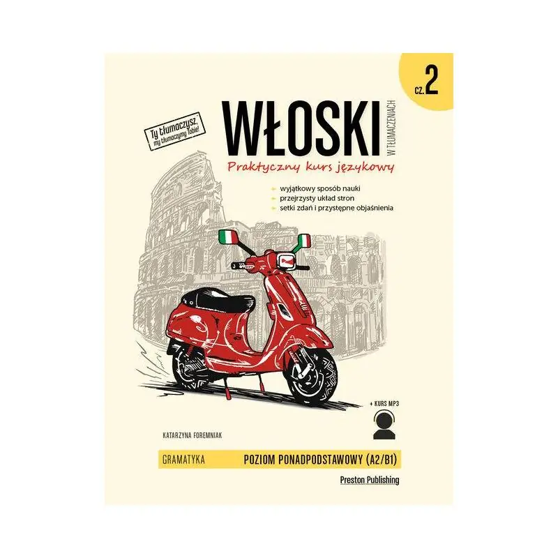 Jeśli chcesz opanować język włoski, przełamać barierę mówienia i swobodnie radzić sobie w sytuacjach komunikacyjnych z zachowaniem poprawności gramatycznej, ta książka jest doskonałym wyborem. „Włoski w tłumaczeniach. Gramatyka. cz. 2” to druga część niezwykle skutecznej i przystępnej serii do nauki języka włoskiego. Książka zawiera: • setki zdań i wyrażeń przydatnych na co dzień, ułożonych według zagadnień gramatycznych, zgodnie ze stopniowaniem trudności, • przystępne wskazówki do zdań ułatwiające zrozumienie zasad gramatycznych języka włoskiego, • ponad 6-godzinne nagrania w postaci kursu audio, który pomoże ćwiczyć wymowę i ułatwi prawidłowe konstruowanie zdań, • jasny, nowatorski i logiczny układ stron, który zmotywuje Cię do regularnej i skutecznej nauki. To książka wymarzona dla samouków i wszystkich, którzy chcą sprawdzić swoje umiejętności językowe na poziomie A2-B1. Zawiera zagadnienia takie jak: czasy przeszłe, czas przyszły, stopniowanie przymiotników, tworzenie przysłówków i wiele innych. Książka prosty i przystępny sposób przekazuje wiedzę na temat konstrukcji gramatycznych i zachęca do ćwiczeń. Jest to doskonałe połączenie gramatyki i rozmówek, dzięki czemu nauczysz się posługiwać językiem naturalnie i poprawnie w codziennej komunikacji.