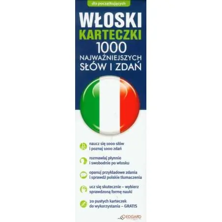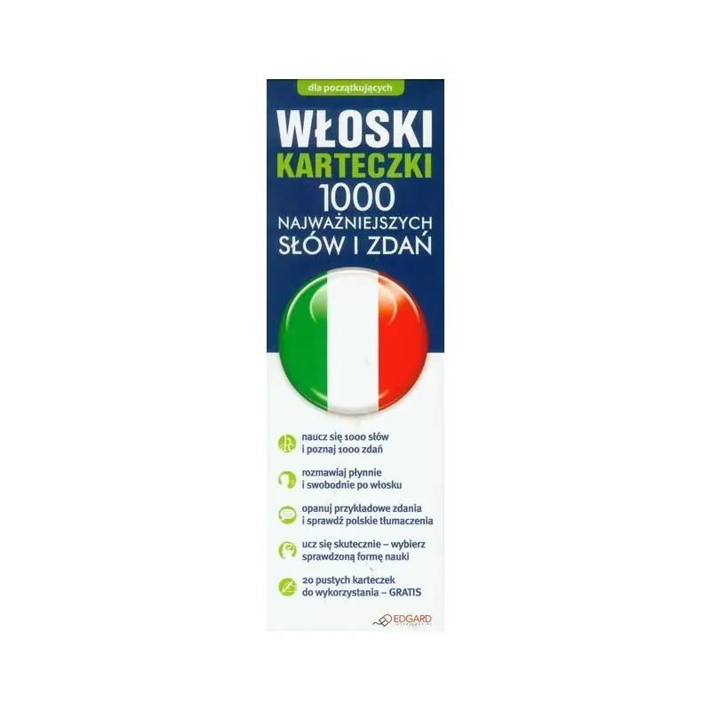 1000 najważniejszych słów wraz z 1000 przykładowych zdań to wyjątkowy zestaw tysiąca ponumerowanych, usztywnionych kartoników do nauki włoskiego. Nauka z kursem pozwala szybko i skutecznie opanować najczęściej używane w języku włoskim słówka. Opanowanie tego unikalnego zestawu umożliwia swobodną komunikację na poziomie podstawowym oraz czytanie większości tekstów w języku włoskim.