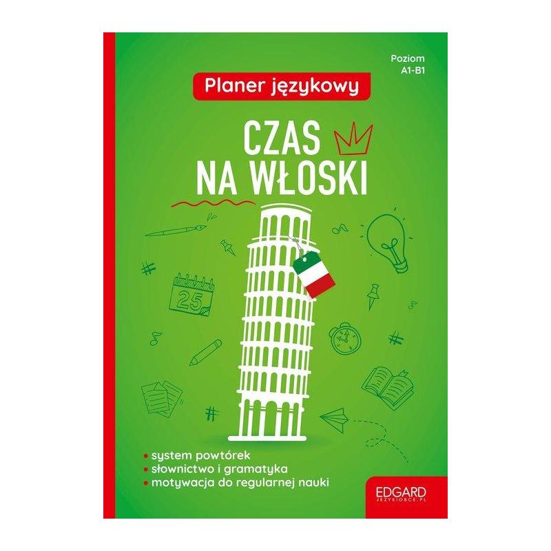 Planer językowy. Czas na włoski to propozycja dla osób, które chcą połączyć naukę włoskiego z codziennym planowaniem, inspirowaniem i realizacją celów. Wykorzystanie metody wiecznego kalendarza pozwala rozpocząć korzystanie z niego w dowolnym momencie, bez konieczności czekania na konkretną datę. Materiał dostosowany jest do początkujących użytkowników języka włoskiego, na poziomie A1-B1, szukających motywacji, natchnienia i pomysłów do dalszej nauki. Już dzisiaj rozpocznij rok regularnej nauki języka włoskiego! Skończ z wymówkami i nie czekaj na nowy tydzień, rok czy specjalną okazję. Ucz się nowego słownictwa i gramatyki oraz ćwicz pamięć w potrójnym systemie powtórek i sprawdzaj wiedzę w testach podsumowujących materiał z kilku tygodni. Nauka wejdzie Ci w nawyk i szybko zauważysz pozytywne rezultaty swoich działań. Podział na małe porcje materiału przeznaczone do codziennej nauki sprzyja przyswajaniu materiału i szybszemu zapamiętywaniu. Podręczny format ułatwia korzystanie z planera w każdej wolnej chwili – w drodze do szkoły czy pracy, w domu, w podróży – można go zabrać ze sobą wszędzie. Kalendarz z podziałem tygodniowym i miesięcznym świetnie sprawdzi się również do prywatnego planowania. Dostosuj planer do własnych potrzeb w strefie wolnej twórczości - pisz pamiętnik, opowiadania i rysuj mapy myśli. Korzystaj ze strefy geograficzno-kulturowej – zbieraj inspiracje, zapisuj ciekawostki oraz terminy spotkań. Sprawdź nowoczesną metodę nauki, motywuj się, realizuj językowe cele krok po kroku i obserwuj efekty! Planer językowy. Czas na włoski to: nauka języka na poziomie A1-B1 roczny plan językowy możliwość rozpoczęcia nauki w dowolnym momencie podział na układ tygodniowy i miesięczny słownictwo i gramatyka potrójny system powtórek testy sprawdzające znajomość materiału cytaty i hasła motywujące strefa wolnej twórczości (pisz pamiętnik, opowiadania, rysuj mapy myśli) strefa geograficzno-kulturowa (zapisuj ciekawostki, zbieraj inspiracje) pomoc w określeniu celów językowych i realizacji