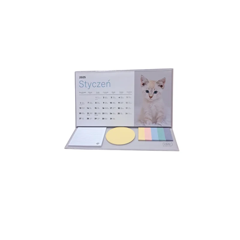 Wygodny kalendarz stojący na biurko z przejrzystym kalendarium w układzie trójdzielnym z poręcznymi karteczkami samoprzylepnymi do notowania. Przydatny zwłaszcza w biurze. W kalendarzu zaznaczono święta i daty imienin.
