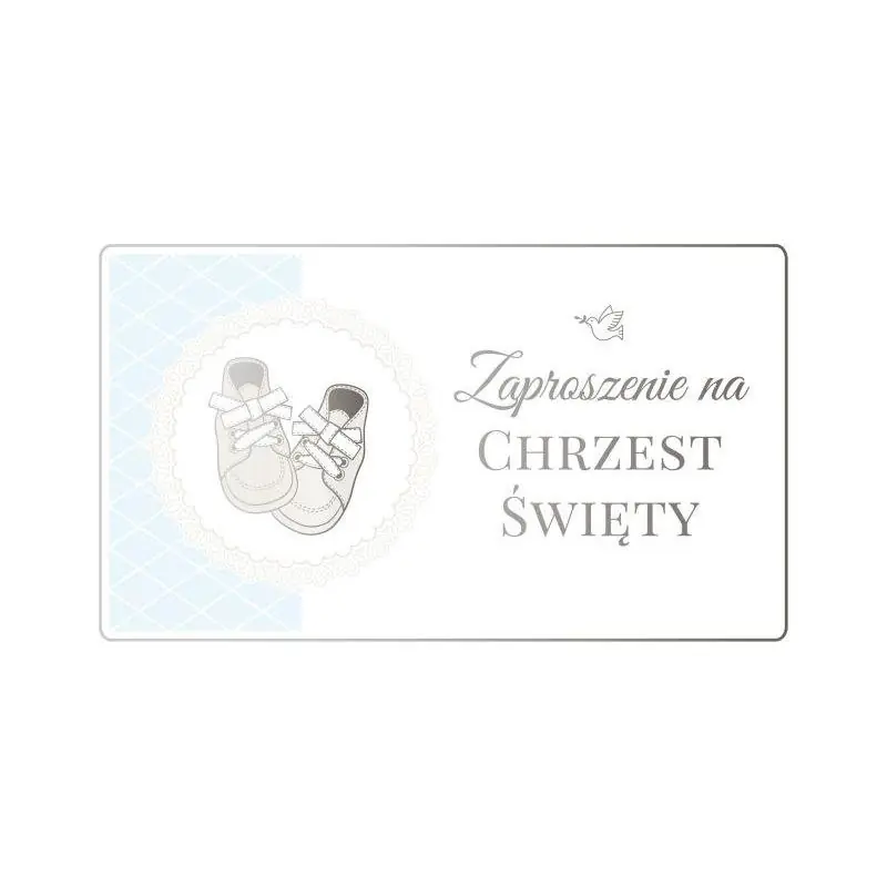 Stylowe zaproszenia na Chrzest Święty dla chłopca to elegancka propozycja utrzymana w klasycznej, błękitnej kolorystyce. Delikatny motyw bucików oraz subtelne zdobienia podkreślają uroczysty charakter wydarzenia. Zaproszenia wykonane są z wysokiej jakości papieru kredowego, a ich poręczny format sprawia, że są wygodne w użyciu i efektownie się prezentują.