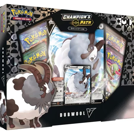 Głęboka i ciepła wełna chroni Dubwool V przed atakami. Za to Twój przeciwnik nie może liczyć na taką ochronę! W walce Dubwool V jest nieustępliwy, to nie jest typowy puszysty Pokémon. Ta kolekcja to mieszanka spokojnego i dzikiego usposobienia Dubwool V. Całość wydana w klasycznej odsłonie Vbox, wzmocniona nowym dodatkiem Champions Path.