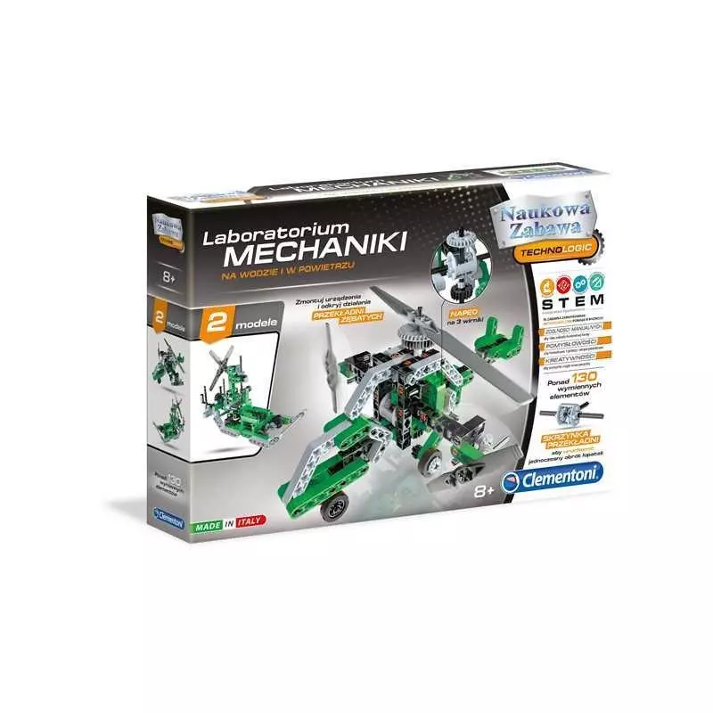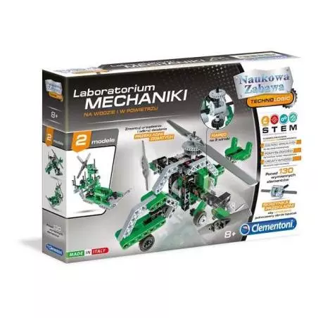 Clementoni Laboratorium Mechaniki Na Wodzie i w PowietrzuTen bogaty zestaw naukowy przeprowadzi dzieci przez tajniki aerodynamiki i mechaniki płynów. Dzięki 130 elementom mogą one tworzyć 2 modele. Instrukcja zawiera wszystkie wskazówki potrzebne do montażu modeli i uczy pierwszych koncepcji inżynierii, fizyki i mechaniki. Konstrukcja, koncepcja i produkcja zabawki są całkowicie wykonane we Włoszech.Zabawka zainspirowana Metodologią Stem. Metodologia ta zrodziła się w celu promowania Nauk Ścisłych, Technologii, Inżynierii i Matematyki. Poprzez eksperymenty dzieci mogą rozwijać swoje umiejętności, poszerzając wiedzę naukową i technologiczną.Laboratorium Mechaniki pomaga w rozwoju:- Zdolności Manualnych, aby idee nabrały konkretnej formy;