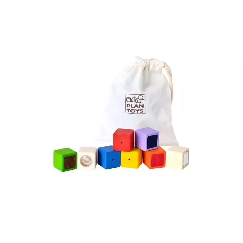 W woreczku znajdują się 3 klocki do rozróżniania dotykiem, 3 - wzrokiem i 3 – słuchem. Zabawka należy do linii PlanPreschool, która szczególny nacisk kładzie na połączenie zabawy z nauką. Starannie zaprojektowane instrumenty muzyczne, gry, układanki, klocki i zabawki manipulacyjne zapewniają wszechstronny rozwój dziecka już od najmłodszych lat. Wymiar podstawowy klocka: 35 mm. Wymiary opakowania: 18,8 x 7,5 x 9,3 cm