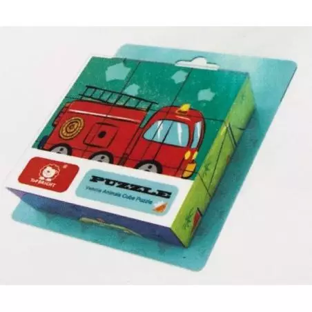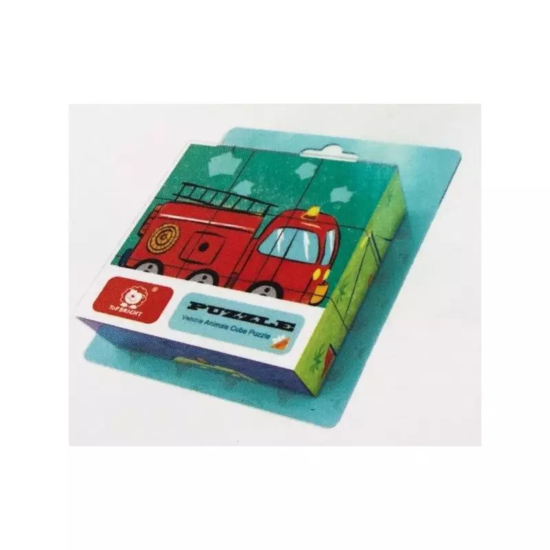 Drewniane klocki obrazkowe z motywem Pojazdów firmy TOP BRIGHT. Zabawka składa się z 9 klocków z każdej strony pokrytych inną grafiką. Zabawka daje możliwość ułożenia 6 różnych obrazków przedstawiających pojazdy – wóz strażacki, statek, ciężarówka, autko, taxi, karetka pogotowia. Każdy pojazd umieszczony jest na innym kolorze tła, co jest dużym ułatwieniem dla najmłodszych dzieci.