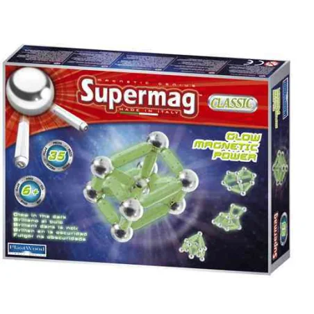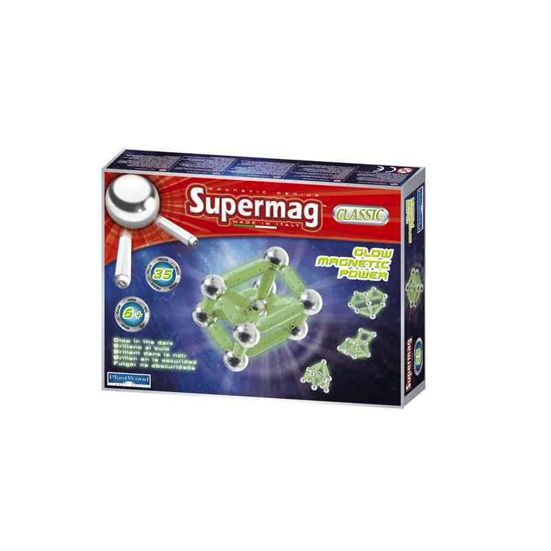 SUPERMAG "The Original Magnetic Toy" to zestaw składający się aż z 98 elementów, z "pałeczkami" w dwóch długościach i klasycznym, zielonym odcieniu. Kolory są głębokie, dzięki czemu zbudowane konstrukcje prezentują się bardzo ciekawie w oczekiwaniu na kolejną przebudowę. Posiadają niezwykłą funkcje... Zostały wykonane ze specjalnego tworzywa, które ładuje się pod wpływem światła, a następnie świecą w ciemności! Wystarczy, że zgasisz światło lub poczekasz do wieczora. Odpowiednio dostosowana siła przyciągania pozwala na "trzymanie się" konstrukcji i wszelkich budowli w ich ciekawych kształtach nieskończenie długo. Duża ilość klocków w zestawie - aż 98 sprawia, że zabawa może być jeszcze bardziej kreatywna, a wyobraźnia szaleć do woli.
