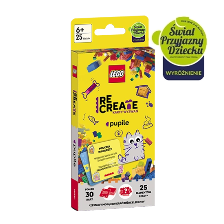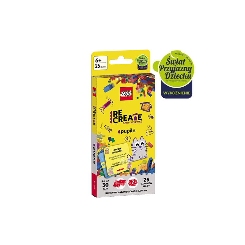 Karty z ciekawymi wyzwaniami do zbudowania z dołączonych klocków LEGO, kreatywna zabawa pobudzająca wyobraźnię, można się bawić samemu lub z przyjaciółmi, zestaw zawiera 32 karty i 25 klocków LEGO, format: 89 x 173 x 22mm (+ 36mm zawieszka)| pudełko