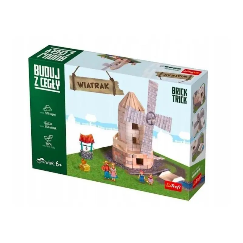 Trefl Brick Trick Wiatrak 60878 to kreatywny zestaw klocków edukacyjnych, który pozwala zbudować realistyczny model wiatraka z prawdziwych miniaturowych cegieł i elementów drewnianych. Ten zestaw Brick Trick Trefl rozwija zdolności manualne i wyobraźnię, umożliwiając samodzielne tworzenie konstrukcji oraz ich wielokrotne