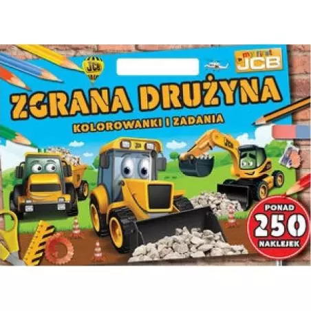 Blok formatu A3 zawierający 23 dwustronne karty. Kolorując kolejne scenki i rozwiązując proste zadania, dziecko poznaje pracę drużyny JCB: koparki Maćka, wywrotki Wojtka, betoniarki Bartka oraz innych sympatycznych maszyn budowlanych
