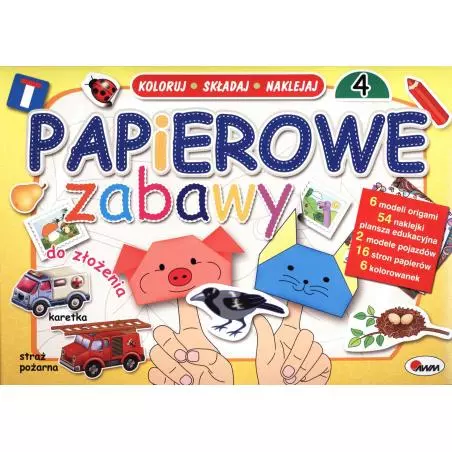 Ta książka zapewni Ci pełną przygód i niespodzianek zabawę! A wszystko możesz wykonać samodzielnie! Z poszczególnych kartek papieru i kilku naklejek powstanie 6 modeli origami. Pokazujemy, jak je złożyć, krok po kroku. Do dyspozycji aż 16 stron specjalnych papierów. Aż 6 specjalnych papierów. Aż 6 specjalnych obrazków czeka na pokolorowanie i uzupełnienie zwierzakami z papierów oraz naklejkami. Dodatkowo 2 pojazdy do samodzielnego złożenia - gotowe do podróży po specjalnej planszy edukacyjnej, którą skompletujesz, kupując kolejne części PAPIEROWYCH ZABAW.