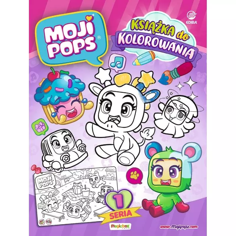 Jesteśmy MojiPops i uwielbiamy się śmiać, marzyć, bawić się i spędzać razem czas. Każda z nas jest wyjątkowa. Chcesz poznać nasze tajemnice? No to do dzieła! Książka do kolorowania dla najmłodszych Fanów bestsellerowej kolekcji MojiPops. Baw się i koloruj. W książce czeka na Ciebie ponad 30 niezwykłych kolorowanek z ulubionymi bohaterkami: Carlo, Spooky, Amy, Sprinks, Tails, AeroFami, Rails i wiele innych Popsów. Dodatkowo znajdziesz w niej trzy figurki kolekcjonerskie z serii 1. Nie ma nic lepszego niż wspólna zabawa z ulubionymi bohaterami.