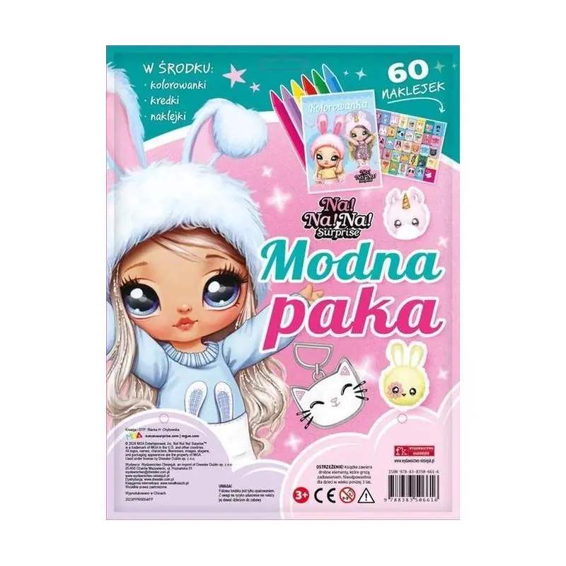 Idealny zestaw na podróż! Kolorowanka z laleczkami Na! Na! Na! Surprise, kredki oraz arkusz z naklejkami zapakowane w foliową kopertę z zapięciem strunowym. Koloruj modne kreacje i ozdabiaj strony, jak tylko zechcesz. W „Modnej pace” znajduje się kilkadziesiąt prostokątnych naklejek.