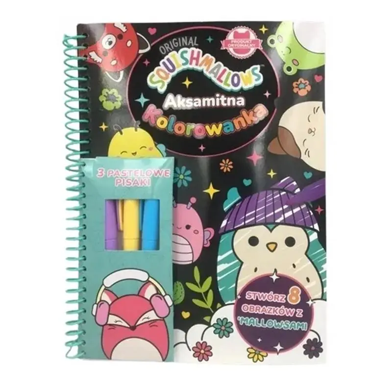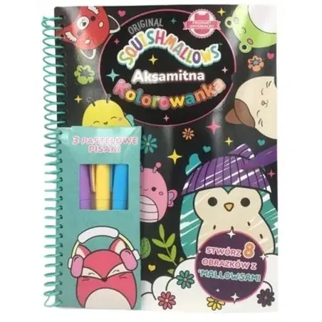 Książka Aksamitna Kolorowanka to atrakcyjne kolorowanki z rysunkami ulubionych bohaterów. Do każdej z publikacji dołączone są piękne 3 pastelowe flamastry. Wystarczy, że dziecko pomaluje obrazek, a rysunki z postaciami ulubieńców nabiorą kolorów. Osiem super miękkich wzorów, trzy piękne pisaki i mnóstwo Squishmallows do pokolorowania - to