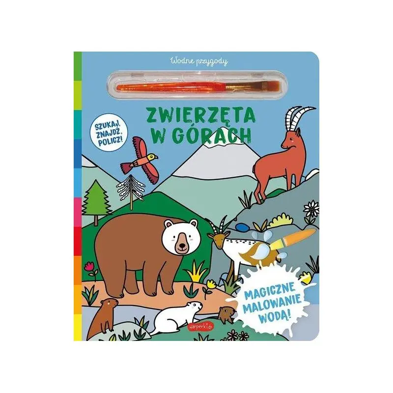 Zwierzęta w górach to kolejny, nowy tytuł w serii Wodne Przygody Akademii Mądrego Dziecka. Na kartonowych stronach książeczki zobaczymy jaka roślinność porasta zbocza gór oraz jakie zwierzęta zamieszkują tereny górskie. Zwierzęta w górach to magiczna kolorowanka, która „pokazuje” swoje kolory, gdy dziecko zanurzy pędzelek w wodzie i pomaluje białe miejsca na stronie. Magicznie pojawiają się różne barwy. Gdy obrazek wyschnie, kolor zniknie i możemy rozpocząć zabawę od nowa. Oprócz zabawy w malowanie, na każdej stronie znajdziemy krótkie polecenie do wykonania, czyli zabawę w „szukaj, znajdź i policz”: „Ile widzisz ptaków?” czy „Policz muflony”. W serii Wodne Przygody Akademii Mądrego Dziecka ukazały się do tej pory: Przyroda, Dinozaury, Jednorożce oraz Moje święta.