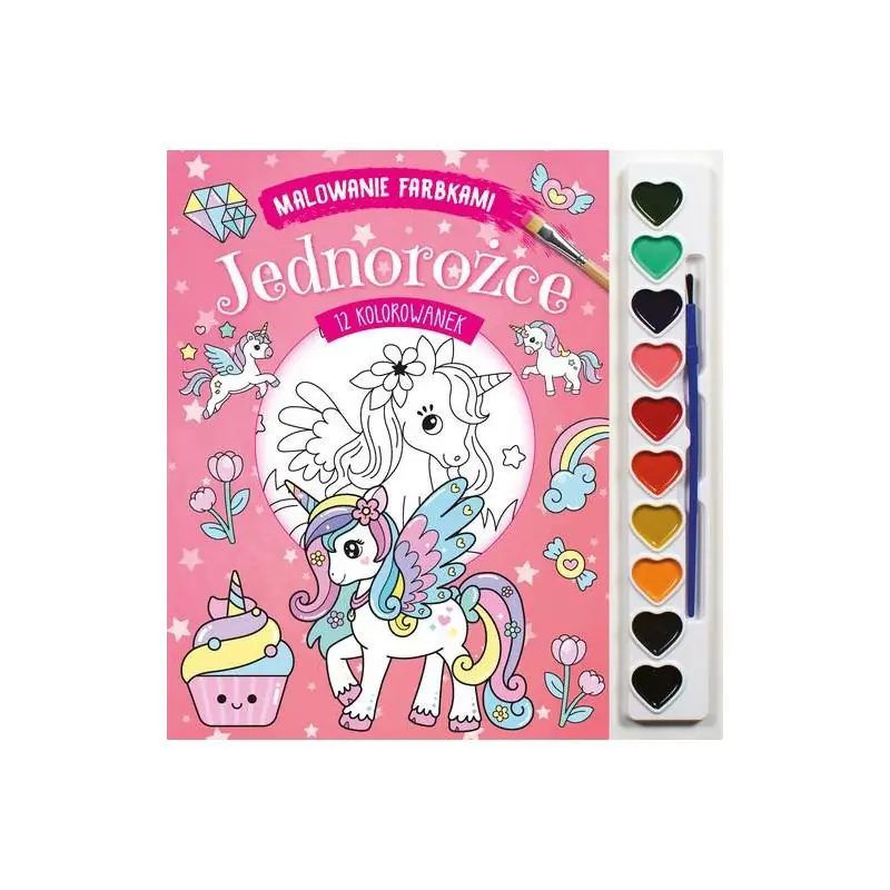 Kolorowanka z zestawem farb i pędzelkiem do malowania! Puść wodze fantazji, chwyć pędzelek do ręki i nadaj czarno-białym obrazkom niesamowite barwy. Kartki możesz wyrwać i ozdobić nimi pokój — Twoje dzieła pozostaną z Tobą na długo!