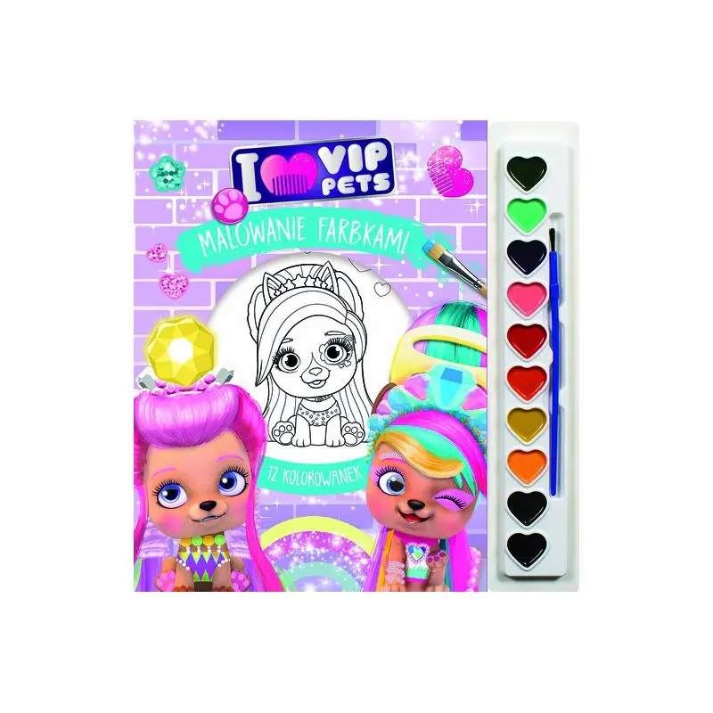 Kolorowanka z zestawem farb i pędzelkiem do malowania! I LOVE VIP PETS to pieski, które kochają wyjątkowe kreacje oraz modne uczesania i każdego dnia odwiedzają salon fryzjerski Fabii i Fabia. Zanurz pędzelek w wodzie, nabierz farby i maluj ich portrety, ciesząc się wspaniałą zabawą. Książka zawiera 12 czarno-białych ilustracji do