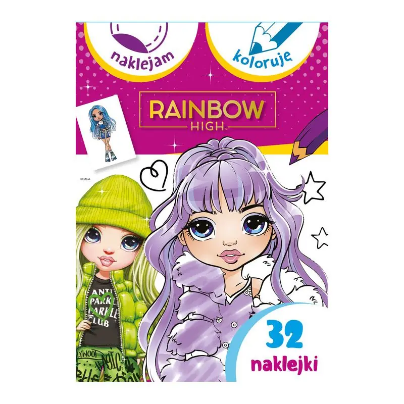 "Naklejam i Koloruję" to książka z fantastycznymi naklejkami i dużymi, prostymi ilustracjami. Wklejając na stronach naklejki z odpowiednimi obrazkami, a potem kolorując rysunki według wzoru, dziecko ćwiczy spostrzegawczość oraz kształci zdolności manualne — kluczowe umiejętności dla wieku przedszkolnego. Dodatkowym atutem są obrazki z popularnymi laleczkami modowymi Rainbow High. W książce znajdują się 32 ilustracje do pokolorowania i 2 strony naklejek.