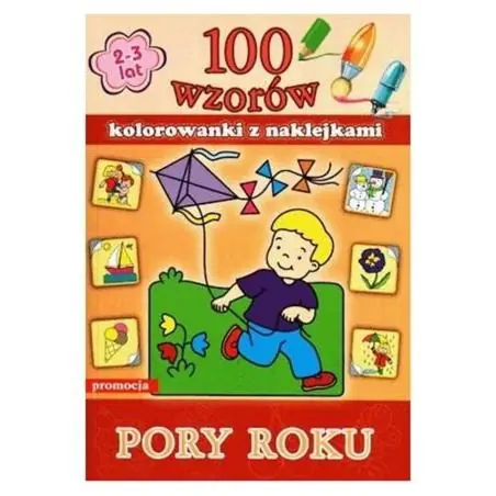 Na serię 100 wzorów z naklejkami składają się 4 tytuły kolorowanek z naklejkami. Książki należące do serii zawierają po 100 czarno-białych ilustracji do kolorowania oraz 2 arkusze z kolorowymi naklejkami. Każda naklejka przedstawia pokolorowaną ilustrację konturową - po odszukaniu i przyklejeniu właściwej nalepki dziecko może kolorować obrazek według wzoru albo dobrać kolory samodzielnie, posługując się własną wyobraźnią. Podpisy pod ilustracjami ułatwiają kojarzenie nazwy z obiektem, co pomaga w nauce czytania. Wyrazy złożono dużą czcionką z konturami, pozwalającą na pokolorowanie literek i dzięki temu utrwalenie pisowni. Tytuły wchodzące w skład serii poświęcone są tematyce lubianej przez dzieci - pojazdy, zwierzęta, przyroda, przedmioty z otoczenia, święta.