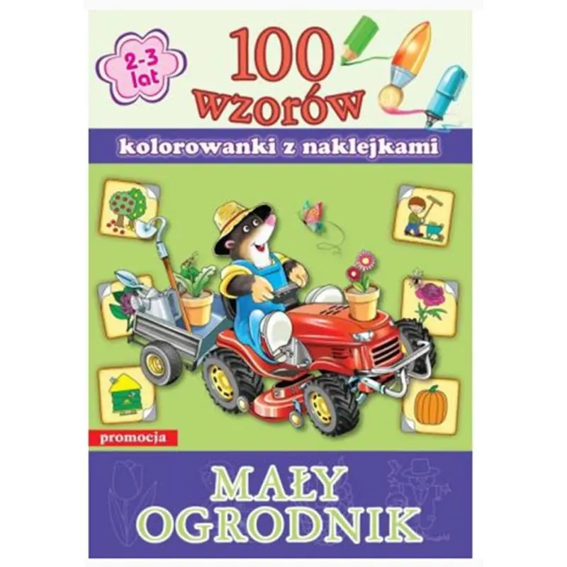 Na serię 100 wzorów z naklejkami składa się 5 tytułów kolorowanek z naklejkami. Książki należące do serii zawierają po 100 czarno-białych ilustracji do kolorowania oraz 2 arkusze z kolorowymi naklejkami. Każda naklejka przedstawia pokolorowaną ilustrację konturową – po odszukaniu i przyklejeniu właściwej nalepki dziecko może kolorować obrazek według wzoru albo dobrać kolory samodzielnie, posługując się własną wyobraźnią. Podpisy pod ilustracjami ułatwiają kojarzenie nazwy z obiektem, co pomaga w nauce czytania. Wyrazy złożono dużą czcionką z konturami, pozwalającą na pokolorowanie literek i dzięki temu utrwalenie pisowni. Tytuły wchodzące w skład serii poświęcone są tematyce lubianej przez dzieci – pojazdy, zwierzęta, przyroda, najbliższe otoczenie, święta.