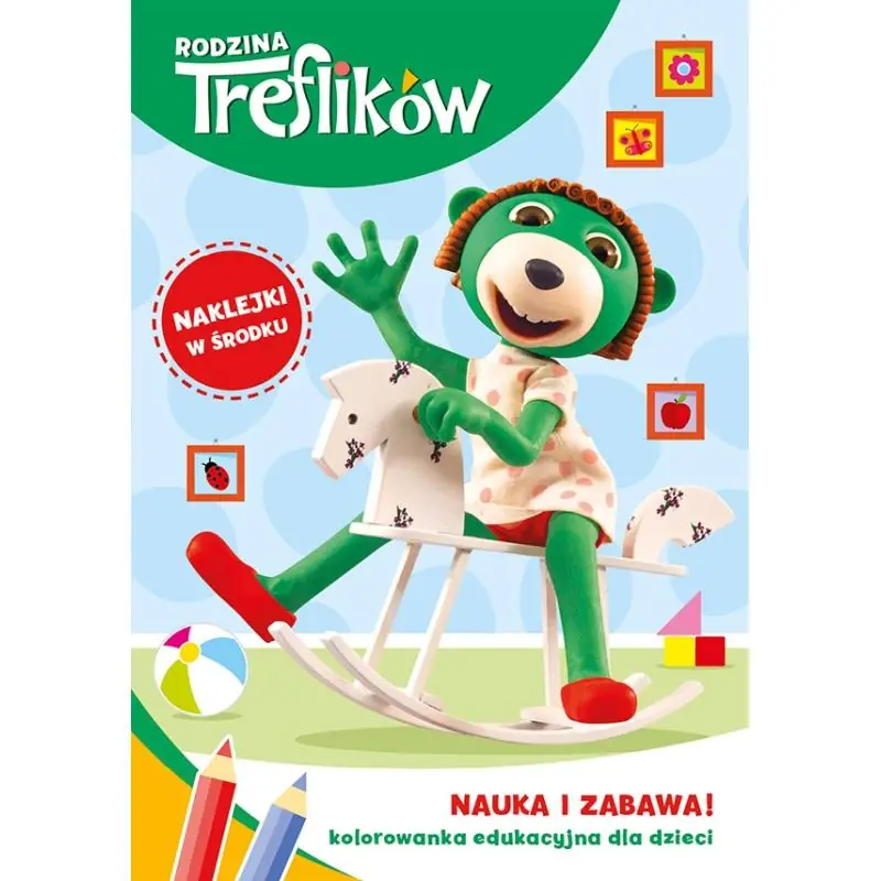 Kolorowanka edukacyjna Rodzina Treflików zawiera zbiór łamigłówek dla dzieci w wieku przedszkolnym z bohaterami ulubionej bajki. Trefliki uczą najmłodszych dzięki wykorzystaniu elementów zabawy. Książeczka zawiera naklejki oraz zestaw ćwiczeń dla dziecka w wieku przedszkolnym, które rozwijają jego myślenie logiczne, koncentrację, poczucie