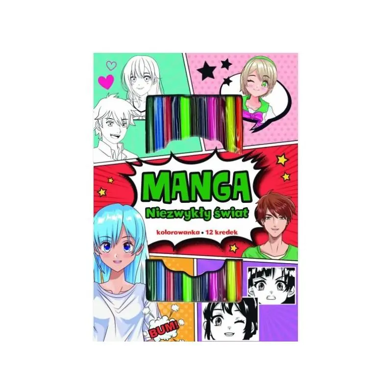 W zestawie znajdziesz 12 barwnych kredek oraz kolorowankę z czarno-białymi rysunkami w stylu manga. Koloruj, jak chcesz i kiedy chcesz. Na pewno powstaną wyjątkowe obrazki!