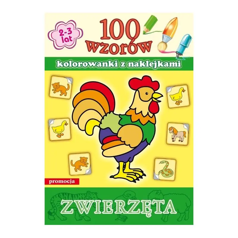 Na serię 100 wzorów z naklejkami składają się 4 tytuły kolorowanek z naklejkami. Książki należące do serii zawierają po 100 czarno-białych ilustracji do kolorowania oraz 2 arkusze z kolorowymi naklejkami. Każda naklejka przedstawia pokolorowaną ilustrację konturową - po odszukaniu i przyklejeniu właściwej nalepki dziecko może kolorować