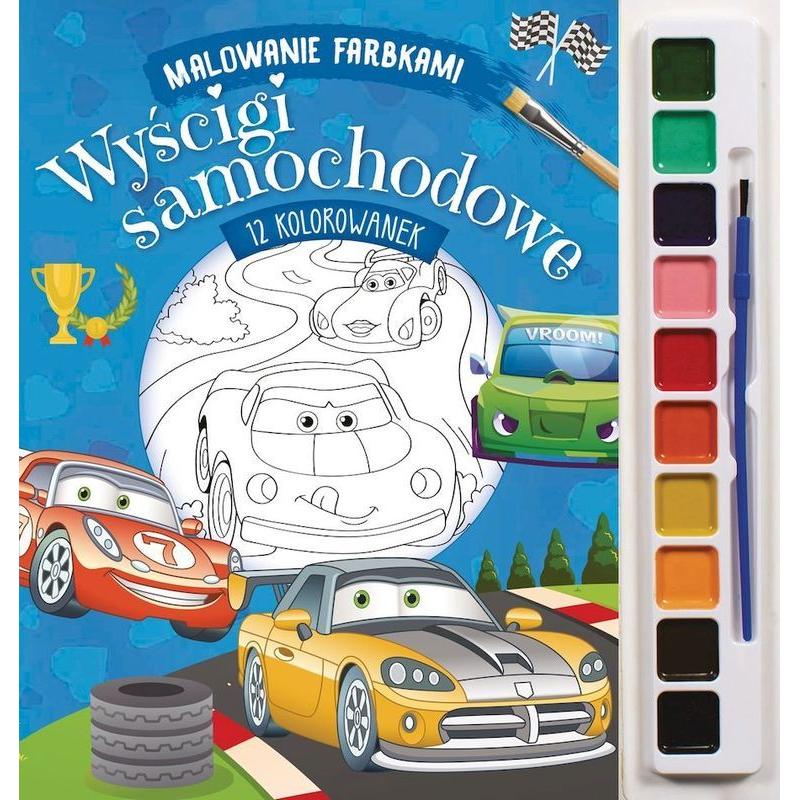 „Wyścigi samochodowe“ to dynamiczna książeczka do malowania farbkami dla dzieci kochających prędkość i rywalizację.