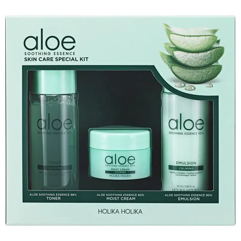 Holika Holika Aloe Soothing Essence Skin Care Special Kit to trzy kroki w pielęgnacji suchej, podrażnionej skóry oparte na soku z aloesu. Zestaw zawiera: