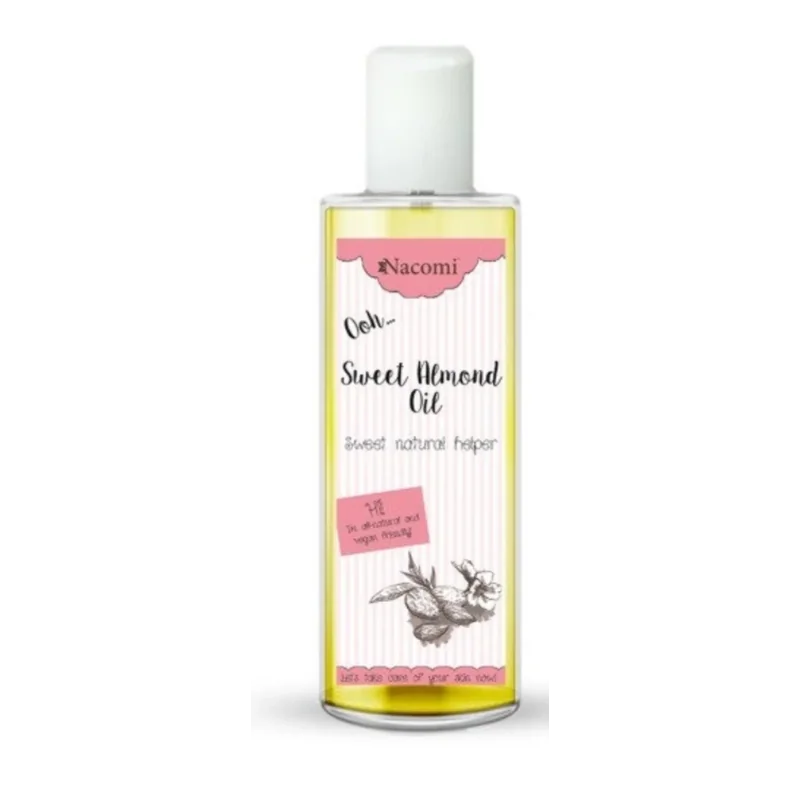Nacomi olej migdałowy to suchy olejek, bogaty w proteiny, sole mineralne oraz witaminy A, E, D i z grupy B. Wysoka zawartość kwasu linolowego (20–30%) i oleinowego (60–70%) sprawia, że produkt intensywnie wygładza, uelastycznia i nawilża skórę, jednocześnie nie pozostawiając tłustej warstwy.
