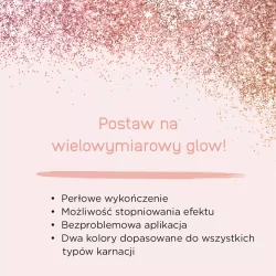 Glow and Go 01 Champagne to wypiekany rozświetlacz, który natychmiast nadaje skórze wielowymiarowy, elegancki blask. Dzięki wysokiej koncentracji opalizujących pereł produkt subtelnie odbija światło, podkreślając naturalne rysy twarzy i dodając cerze świeżości. Jedwabista formuła pozwala uzyskać efekt od delikatnego rozświetlenia po intensywny glow, idealny zarówno na co dzień, jak i na wieczorne wyjścia.