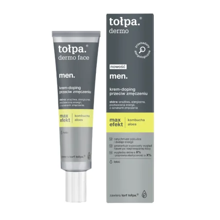 TOŁPA DERMO MEN MAX EFEKT to zaawansowany krem dopingujący przeciw zmęczeniu, stworzony specjalnie dla mężczyzn, których skóra jest wrażliwa, alergiczna, pozbawiona energii i narażona na stres. Dzięki połączeniu kombuchy, aloesu oraz torfu tołpa® krem natychmiast pobudza skórę, przywraca jej świeżość i zapewnia wypoczęty wygląd nawet