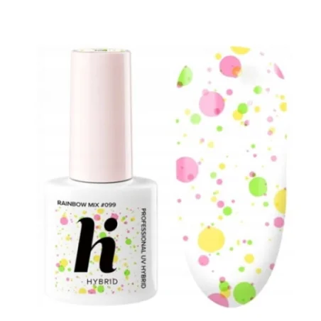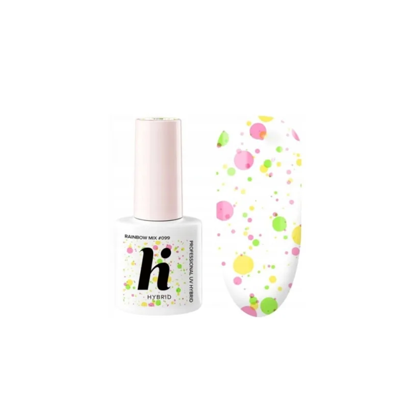 Lakier hybrydowy Hi Hybrid Rainbow Mix to idealny wybór dla osób, które lubią kreatywne, kolorowe paznokcie. Dzięki barwnym piegom możesz uzyskać efektowny, wiosenny manicure, który przyciąga uwagę i pozwala na indywidualną stylizację. Doskonale komponuje się z innymi kolorami, w tym neonami, umożliwiając tworzenie unikalnych, tęczowych efektów.