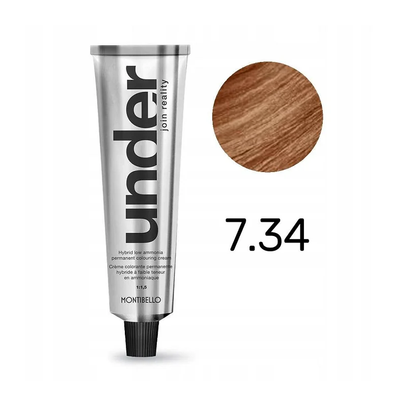 Montibello Under Color 7.34 Średni Miedziany Złoty Blond to profesjonalna farba do włosów przeznaczona dla fryzjerów i wymagających użytkowników domowych. Łączy w sobie wysoką jakość koloryzacji, intensywny połysk i ochronę struktury włosa. Ciepły, pełen blasku odcień 7.34 to