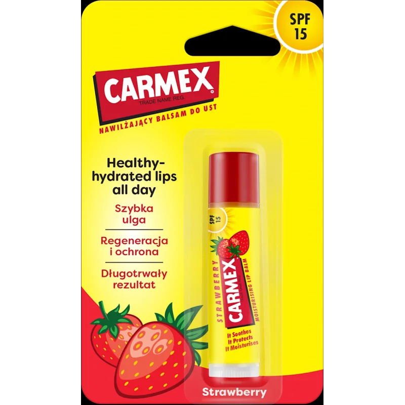 Carmex Balsam do ust Truskawkowy SPF 15 zapewnia całodobową ochronę i intensywne nawilżenie. Dzięki praktycznej formie sztyftu i przyjemnemu truskawkowemu aromatowi jest wygodny w użyciu i idealny do codziennej pielęgnacji ust, niezależnie od warunków pogodowych.