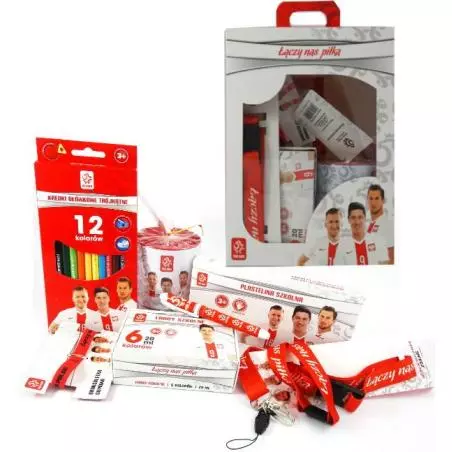Niezbędnik młodego kibica PZPN to połączenie wyprawki szkolnej i prezentów dla najmłodszych fanów. Wszystkie elementy mają nadruki w kolorystyce biało-czerwonej, z twarzami reprezentantów Polski w piłce nożnej.