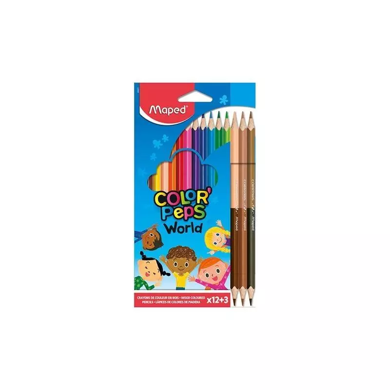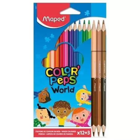 Kredki Color’Peps World 12 kredek plus 3 kredki dwustronne w 6 kolorach odpowiadających odcieniom skóry dzieci z całego świata.