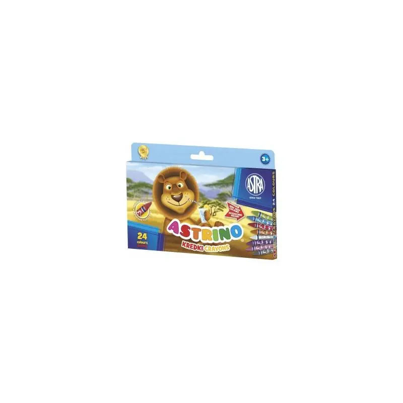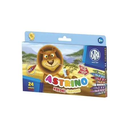Kredki Astrino mają żywe, intensywne kolory oraz doskonałe właściwości kryjące, nie kruszą się, nie pylą i nie brudzą rąk. Nie wymagają temperowania. Kredki pozwalają kreślić łagodne, jednolite linie na wszystkich rodzajach papieru. Idealnie nadają się również do rysowania, wypełniania dużych płaszczyzn i wykonywania miękkich przejść pomiędzy kolorami. Każda kredka posiada papierową ochronną owijkę.