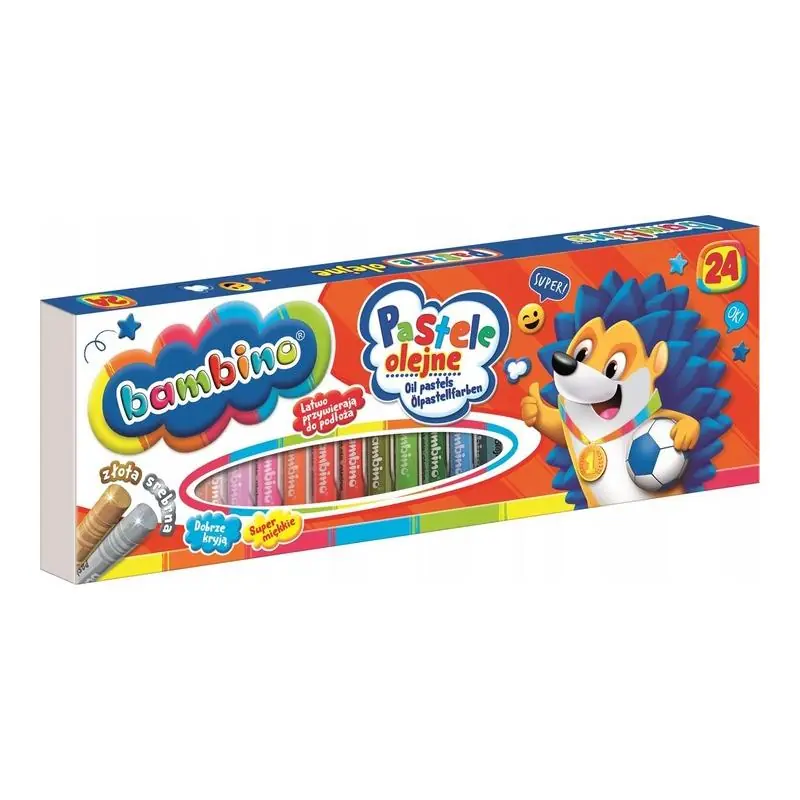 Pastele olejne Bambino 24 kolory to zestaw stworzony z myślą o dzieciach, uczniach i młodych artystach, którzy chcą rozwijać swoje zdolności plastyczne w domu, szkole lub przedszkolu. Charakteryzują się intensywnymi kolorami, miękką konsystencją i łatwością nakładania na papier. To doskonały wybór do nauki rysowania, kolorowania i eksperymentowania z fakturą i mieszaniem barw.