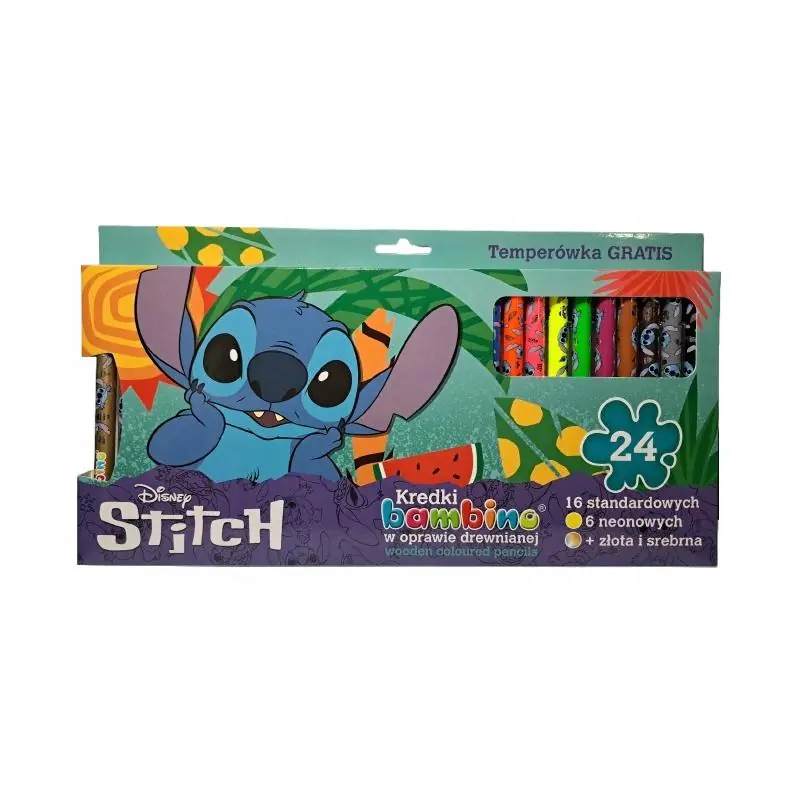 Disney Stitch Kredki Bambino drewniane dwadzieścia cztery kolory z temperówką to praktyczny i estetyczny zestaw plastyczny, który sprawdzi się zarówno w domu, jak i w placówkach edukacyjnych. Połączenie intensywnych kolorów, solidnego wykonania oraz bajkowego designu czyni go idealnym wyborem dla dzieci.